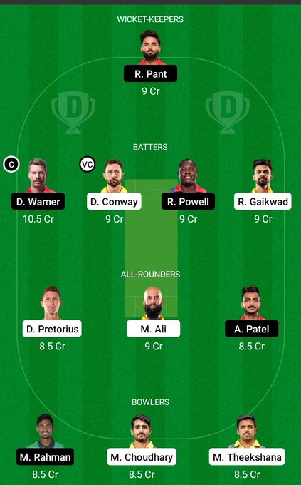 Prithvi Shaw, David Warner, Mitchell Marsh, Rishabh Pant (c & wk), Rovman Powell, Lalit Yadav, Axar Patel/Ripal Patel, Shardul Thakur, Khaleel Ahmed, Kuldeep Yadav, Mustafizur Rahman/Anrich Nortje .