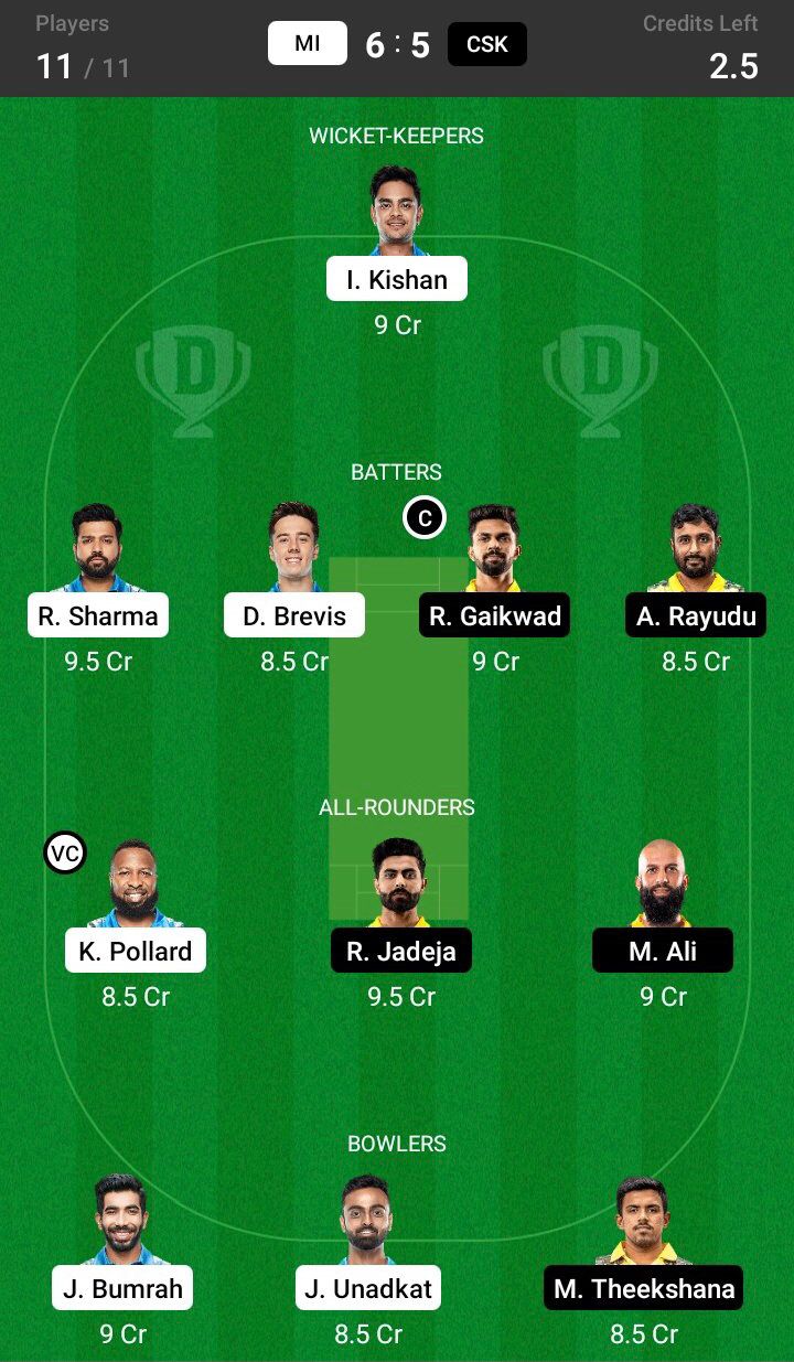 Rohit Sharma (c), Ishan Kishan (wk), Dewald Brevis, Suryakumar Yadav, Tilak Varma, Kieron Pollard, Fabian Allen , Murugan Ashwin, Jaydev Unadkat, Riley Meredith, Jasprit Bumrah