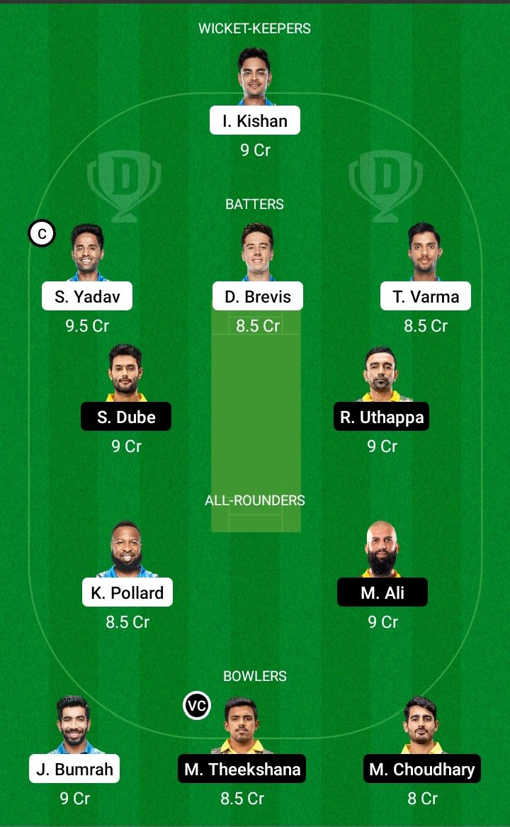 (Budget) Brevis and Varma: Brevis, in that form, isn't a bad choice for Captain either but will be risky going by the law of averages since he clicked in the last few games. Tilak Varma is a sure pick. No one has more runs in Middle overs this season than him where he averages a healthy 54 with a strike rate of 151.