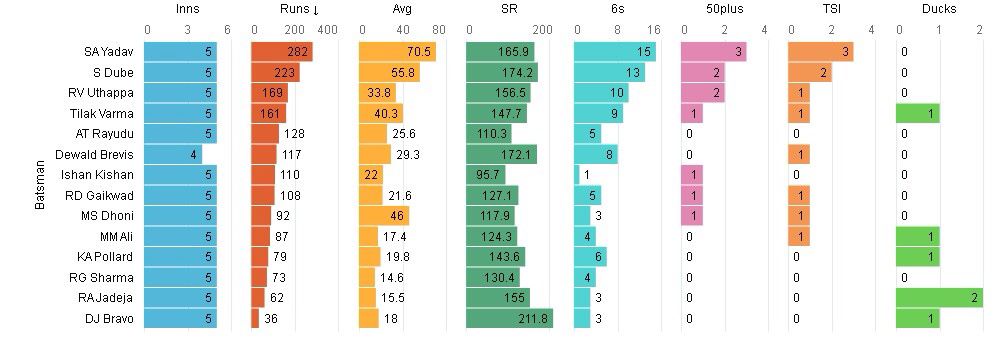 Their bowling has looked ordinary though, Bumrah being the sole contributor with his dots. Unadkat and Thampi haven't bowled to their potential and Murugan has had issues with accuracy. Thanks to Surya's return, their batting isn't doing as bad as before.