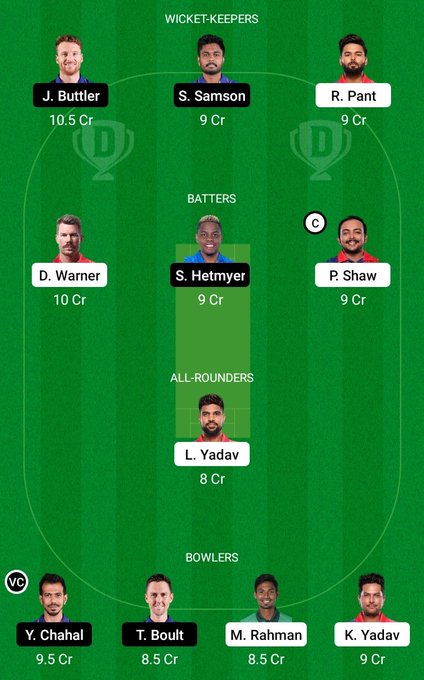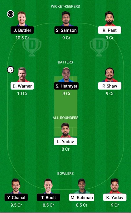 Devdutt Padikkal/Yashasvi Jaiswal, Jos Buttler, Sanju Samson(c & wk), Shimron Hetmyer, Riyan Parag, Karun Nair, Ravi Ashwin, Trent Boult, Obed McCoy, Yuzvendra Chahal, Prasidh Krishna