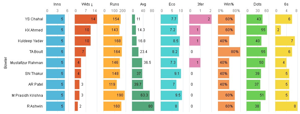 Yuzvendra Chahal: Purple cap holder with 17 wkts at an eco of 7.3. The spin duo of Ashwin & Chahal have been RR's biggest strength in the middle overs. Chahal has taken 12 wkts in the middle overs, just behind Kuldeep who has scalped 13 wkts. A hattrick in the dying hours of the last game sealed the game in RR's favour.