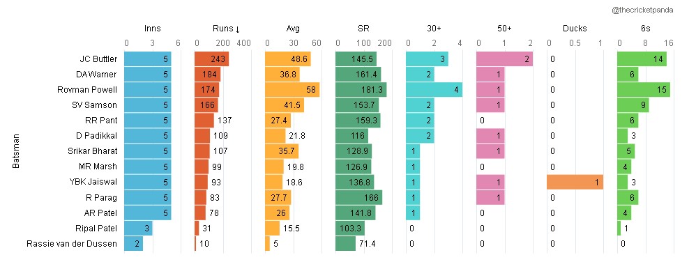 Rovman Powell: Promoted to no 4 against Eng in the t20i series in Jan, Powell smashed a scintillating 100 and announced his comeback in the national side in style. There were expectations of similar fireworks in IPL, but he failed in the 1st half. His entry point were questionable in few games since he is still vulnerable against leg spin but he has played 4 back to back amazing knocks and scored 171(87) before facing CSK in the last game. 1st non opener to score a 50 for Delhi this year.