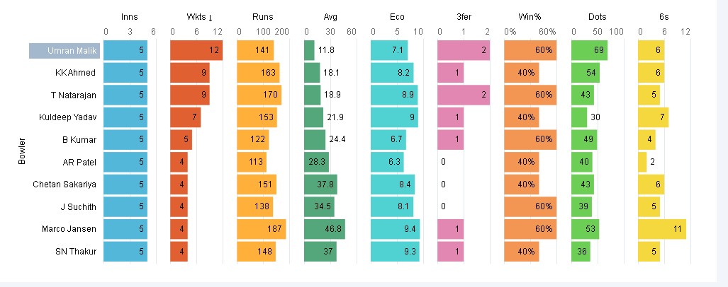 It won't be wrong to say SRH are by far the best bowling unit in this tournamnet. SRH's management should be lauded for having faith in Bhuvi and Natarajan during auctions given their injury concerns and form in last 18 months. T Natarajan has led from the front with 17 wkts, Fast bowling sensation Umran Malik has 15 wkts after a shaky start to the season. Suchit had filled in for Sundar in his absence. Jansen ran through RCB's and KKR's top order in back to back games and Bhuvi has scalped 9 wkts at an eco of 7.3. SRH are the best bowling unit in death overs with 23 wkts at an avg of 14.8. They had a rare bad day at the office against GT but who has succeded against the wrath of Miller, Tewatia & Rashid. Coming to the batting department, SRH were the 2nd worst performers in PP with a scoring rate of 6.81 before the last game. Kane Williamson has been a major let down and hasn't contributed at all apart from a 50 against GT.