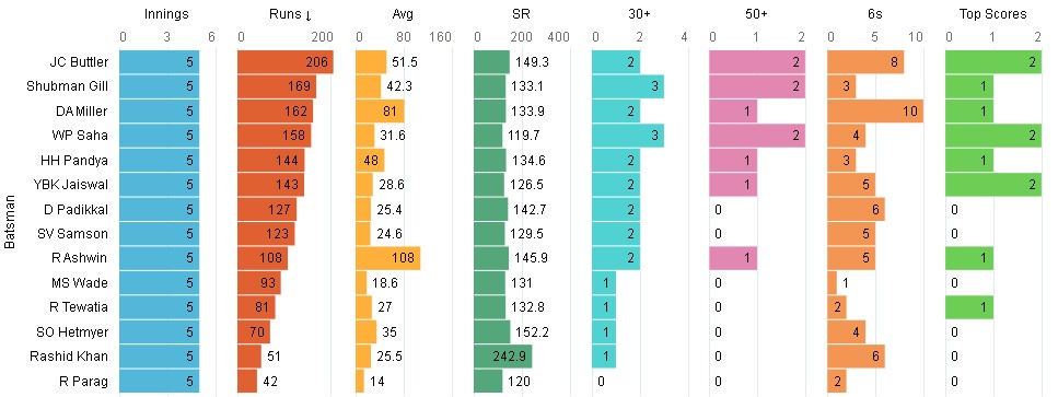 Rajasthan Royals have tasted massive succes inspite of fileding a weak batting line up with a long tail. Majority of the success goes to Jos Buttler who has notched up 824 runs at a SR of 151. If RR bat 1st, he holds one end and bats through the innings. If RR are chasing, he breaks the game in Powerplay itself. Before playoffs he suffered a dip in form which was inevitable and expecting the same from him for the duration of the league stage is foolish. There has been an encouraging development for RR in the last few innings when Jaiswal or Padikkal have each contributed. Padikkal has scored 227 runs in middle overs at s SR of 140 and Jaiswal has put up 212 runs in his last 6 innings. Perhaps, RR's unsung hero has been Shimron Hetmyer. He has been the leagues's best batsman in end overs. Since 2021, he has scored 343 runs at a SR of 207 and this year he has scored 210 runs at a SR of 214.