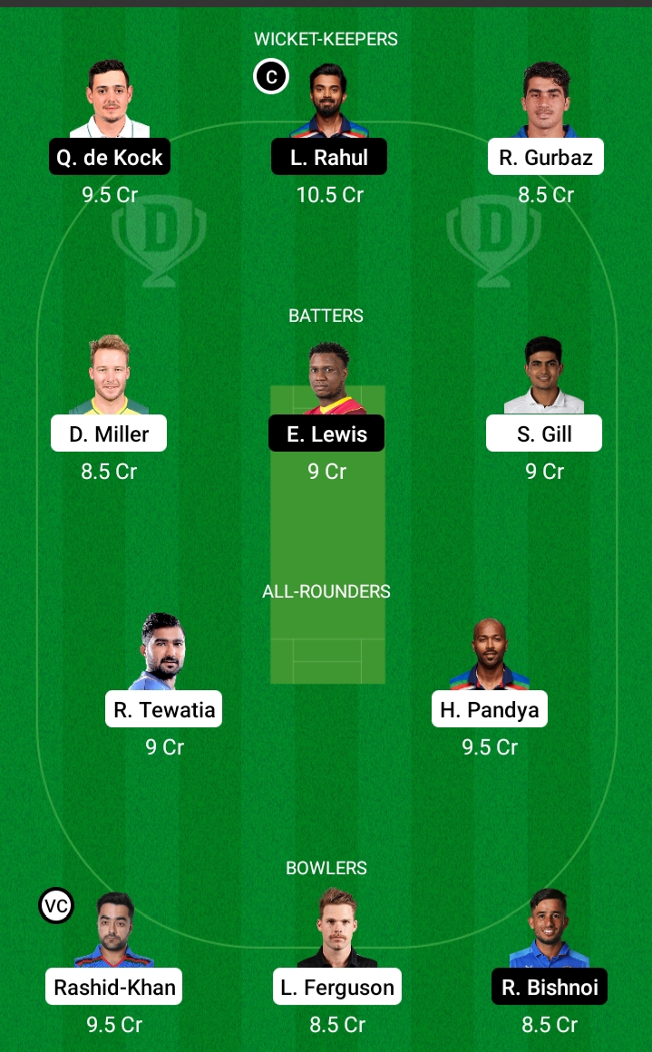 Shubhman Gill, Rahmanullah Gurbaz, Vijay Shankar, David Miller, Hardik Pandya (c), Matthew Wade(wk), Rahul Tewatia, Rashid Khan, Mohammad Shami, Lockie Ferguson, Varun Aaron