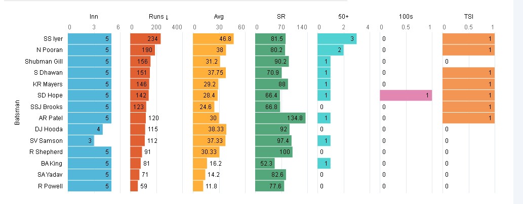 The retirement of Ben Stokes, the extension of the IPL window, and the rise of new leagues over the past 2 weeks have all fueled discussions about ODI relevance and the need to scrap them because of waning viewer enthusiasm. Contrary to all these things we had 2 thrilling last over finishes in the ongoing ODI series and after a long time we have witnessed a hard fought series between the 2 sides. Axar Patel broke many records during his innings of 64 from 35 balls on Sunday. He walked in when Ind needed 110 in around 11 overs. He became the only batter after Mohammad Kaif to top score in a 300 run chase batting at 7 or below. WI had their moments in both the games esp in the last one where they had almost sealed the game after Samson's run out on 54. Shai Hope registered his 13th ODI 100 and his 3rd against Ind since 2018. Shreyas Iyer continued his impressive run against the Windies where he scored his 7th 50 in 9 innings. Avesh Khan had a forgettable debut as he registered the worst nos for Ind on ODI debut ( thoose who bowled atleast 5 overs )