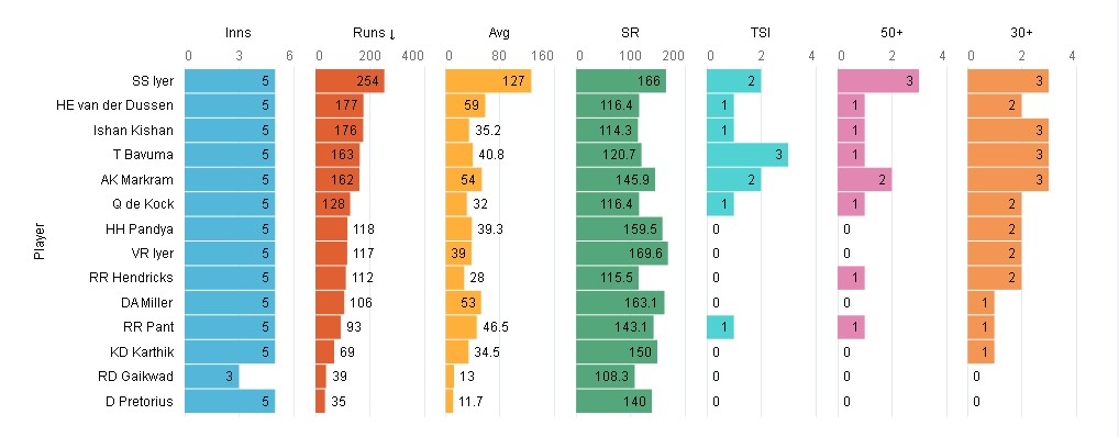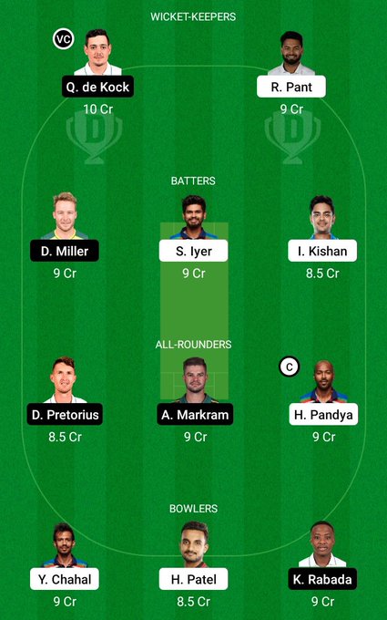 Ruturaj Gaikwad, Ishan Kishan, Shreyas Iyer, Rishabh Pant (c, wk), Hardik Pandya, Dinesh Karthik, Venkatesh Iyer, Axar Patel, Bhuvnenshwar Kumar, Harshal Patel, Yuzvendra Chahal