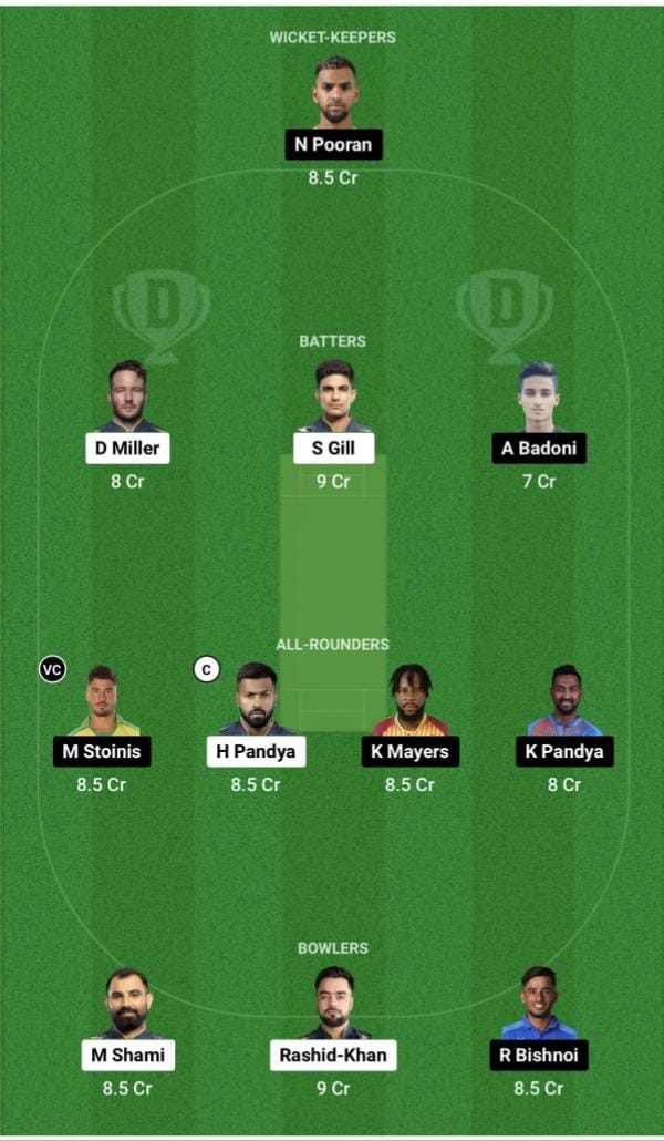 Kyle Mayers/Quinton de Kock, Manan Vohra, Ayush Badoni, Marcus Stoinis, Deepak Hooda, Nicholas Pooran (wk), Krunal Pandya (c), Krishnappa Gowtham, Naveen-ul-Haq, Ravi Bishnoi, Mohsin Khan.