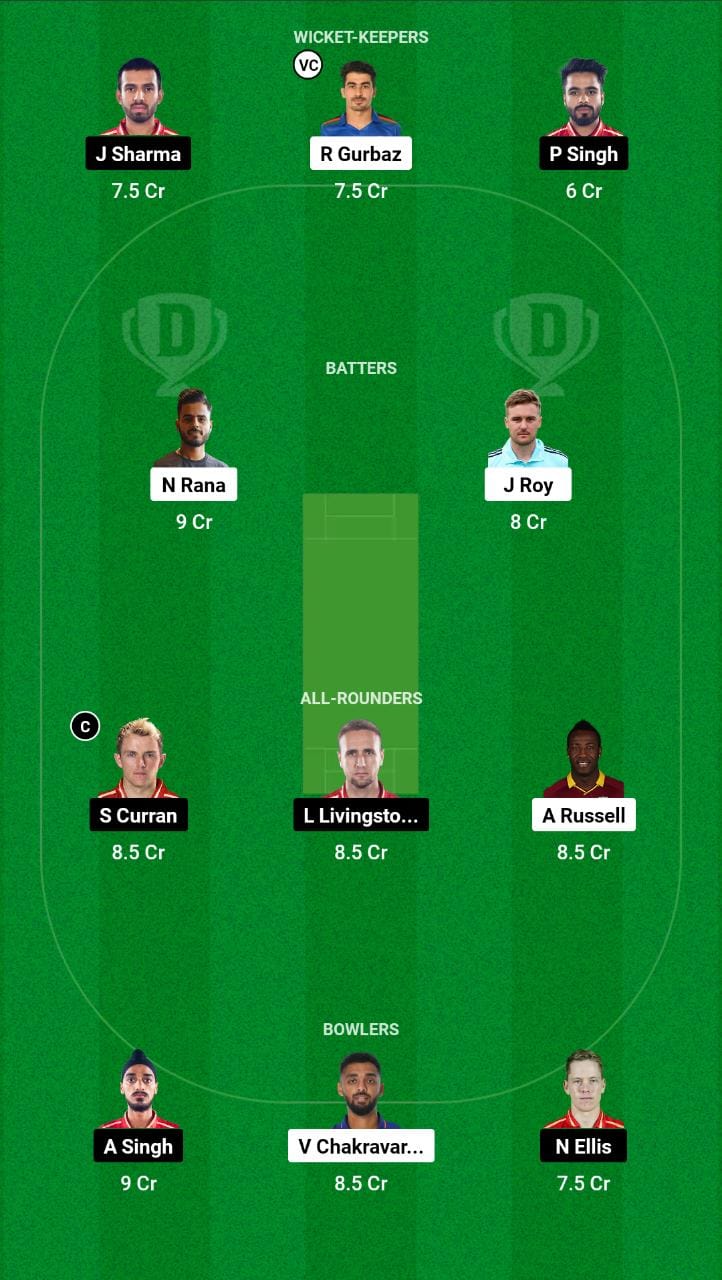 Jason Roy, Rahmanullah Gurbaz, Venkatesh Iyer, Nitish Rana (c), Rinku Singh, Andre Russell, Shardul Thakur, Sunil Narine, Harshit Rana, Varun Chakravarthy, Suyash Sharma