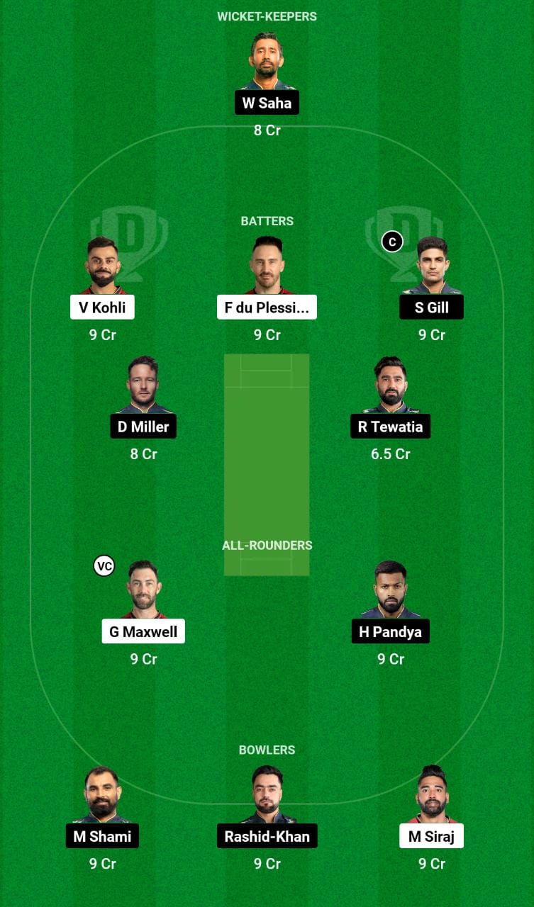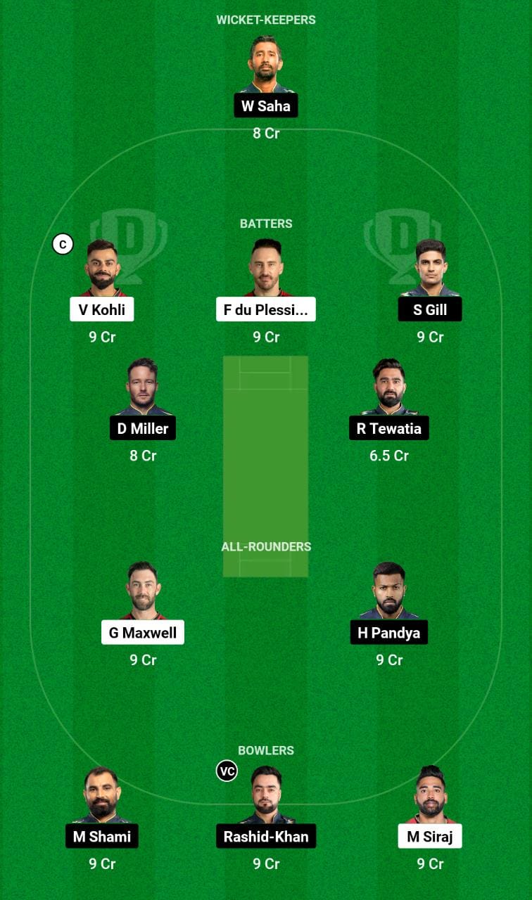 Wriddhiman Saha(w), Shubman Gill, Vijay Shankar, Hardik Pandya(c), David Miller, Rahul Tewatia, Abhinav Manohar, Mohit Sharma, Rashid Khan, Mohammed Shami, Noor Ahmad
