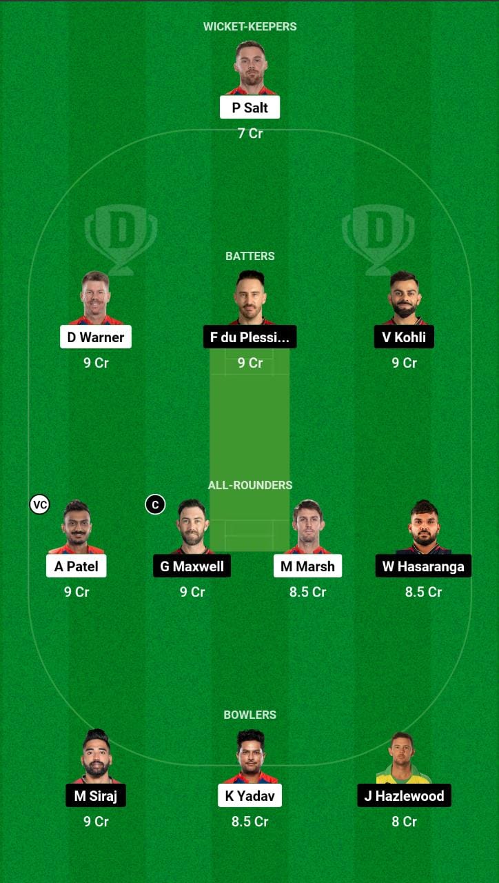 Faf du Plessis (c), Virat Kohli, Mahipal Lomror, Glenn Maxwell, Dinesh Karthik ( wk ), Wanindu Hasaranga, Shahbaz Ahmed, Karn Sharma, Harshal Patel, Josh Hazlewood, Mohammad Siraj