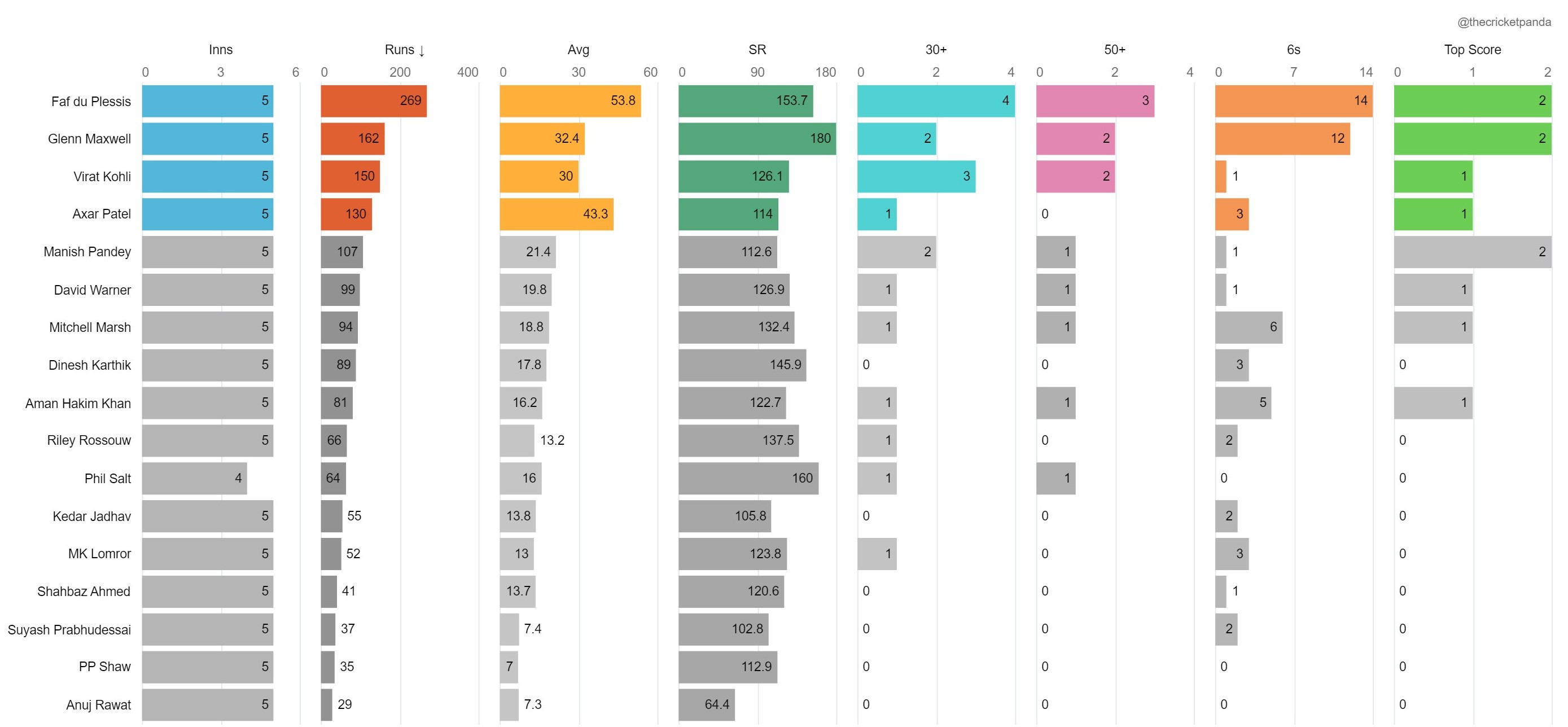 In 2021 and 2022, Maxwell scored 814 runs for RCB at a SR of 152. No one scored more runs than him at a better rate and he did it by batting at 4 or below. He is also an effective off spinner who bowled a few economical overs in Powerplay. With Rajat not in the scene and DK not among runs in the recent past, the onus of carrying the middle order solely lies on him. He is striking at 183 this season with 262 runs.