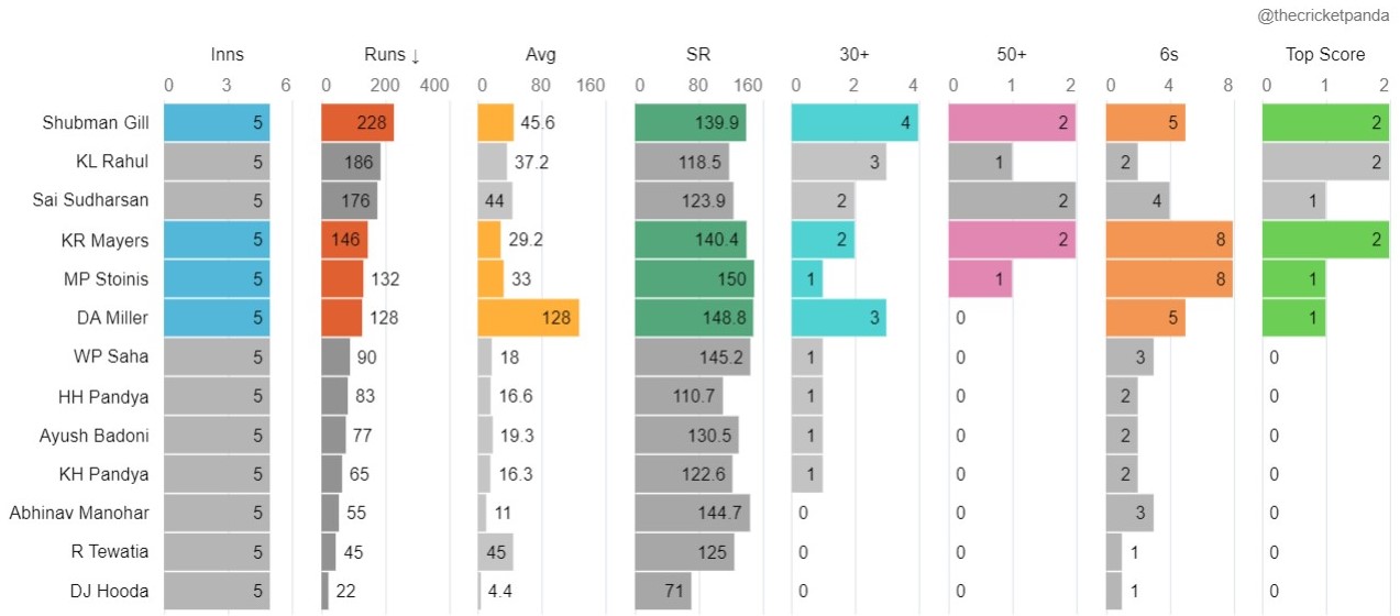 In contrast to their rivals for this match, Gujarat Titans have no significant concerns with their team so far. Every player, from the top order to the middle order to the bowlers, has made excellent contributions to the team's success thus far, and they will be keen to carry that momentum forward into their upcoming match.