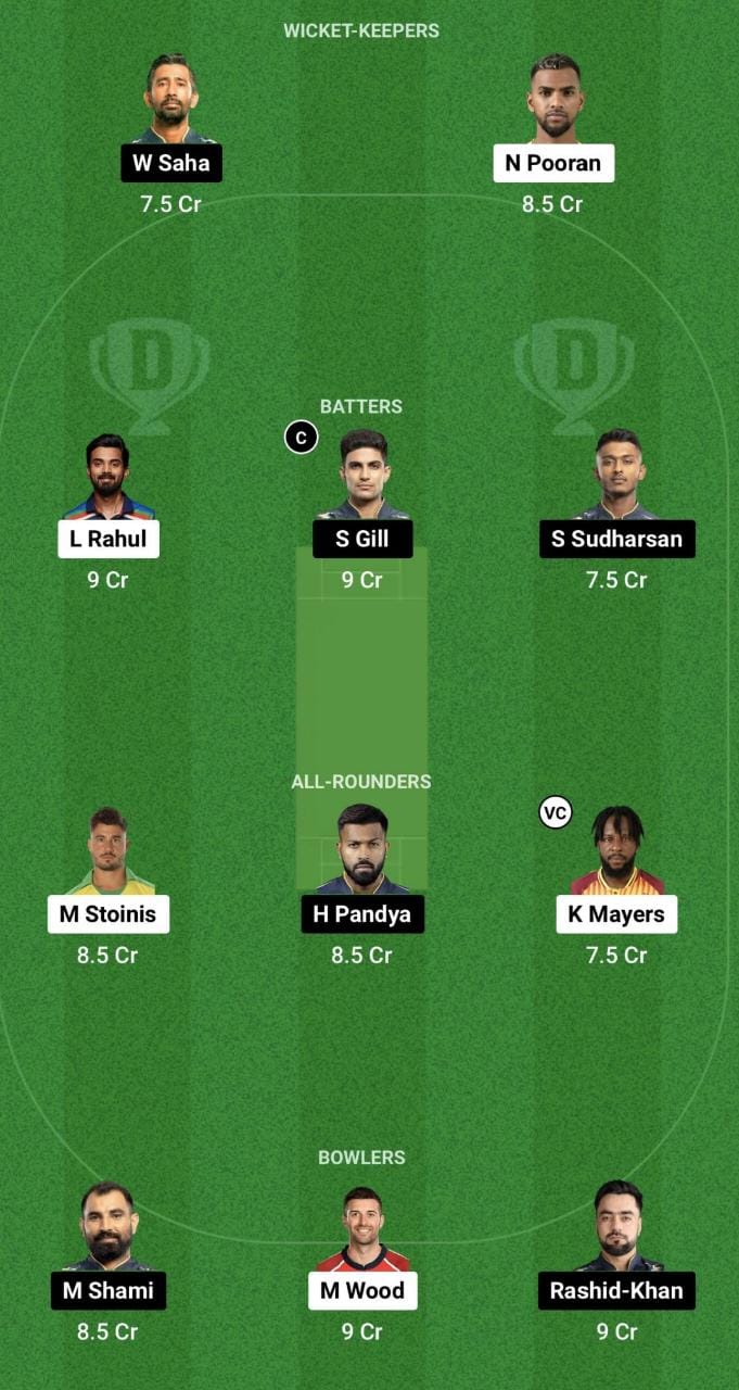 KL Rahul (c), Kyle Mayers/Quinton de Kock, Deepak Hooda/Manan Vohra, Nicholas Pooran (wk), Marcus Stoinis, Krunal Pandya, Ayush Badoni, Ravi Bishnoi, Mark Wood/Naveen ul Haq, Avesh Khan, Yudhvir Singh Charak/Mohsin Khan.