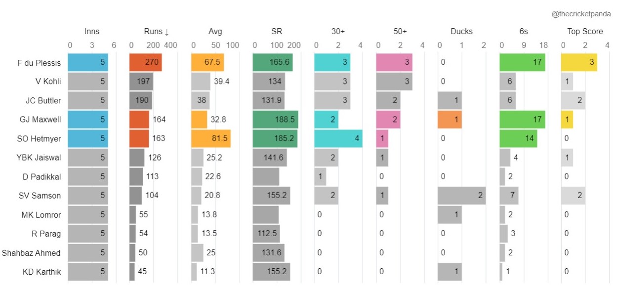 Nevertheless, the most significant and noteworthy aspect in favor of RCB is their enhanced strategy during the Powerplay phase. In the previous season, their scoring rate during the Powerplay was second-lowest in the league, and they were not among the top five teams with regard to hitting sixes. However, the opening partnership of Virat and Faf has been exceptional, having amassed nearly 450 runs in six matches at an impressive run rate of 9.