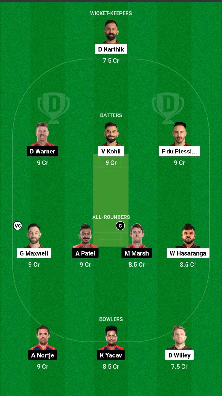 Faf du Plessis (c), Virat Kohli, Mahipal Lomror, Glenn Maxwell, Dinesh Karthik ( wk ), Wanindu Hasaranga, Shahbaz Ahmed, Karn Sharma, Harshal Patel, David Willey, Mohammad Siraj