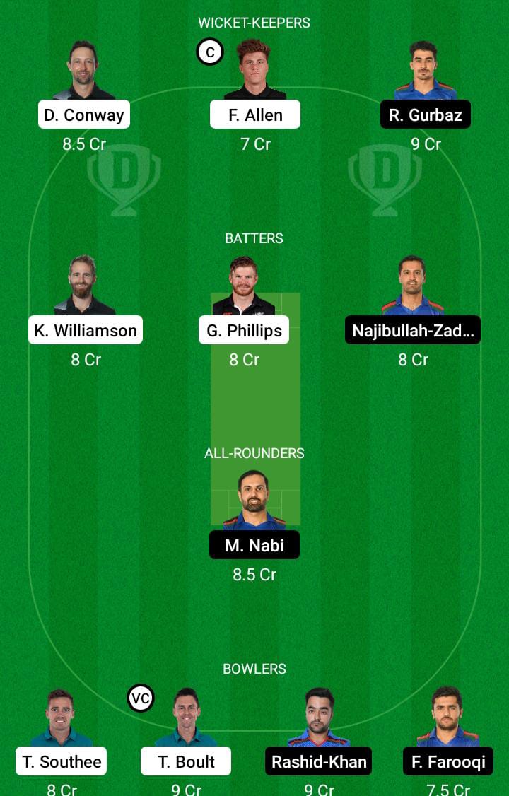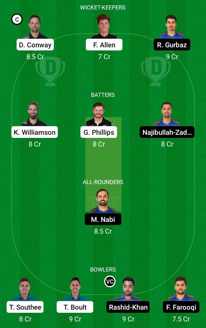Finn Allen, Devon Conway, Kane Williamson, Glenn Phillips, James Neesham, Mark Chapman, Mitchell Santner, Tim Southee, Ish Sodhi, Lockie Ferguson, Trent Boult