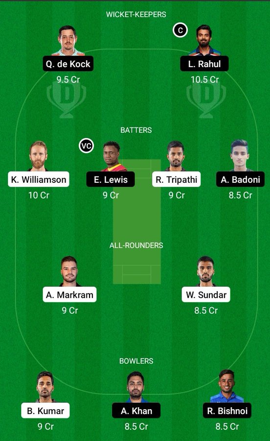 KL Rahul (c), Quinton de Kock (wk), Ewin Lewis, Manish Pandey, Deepak Hooda, Ayush Badoni, Krunal Pandya, Jason Holder, Dushmantha Chameera/Andrew Tye, Avesh Khan, Ravi Bishnoi