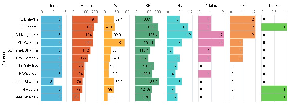 The Punjab Kings campaign started with a bang by chasing 205 v RCB, defended a modest total according to Brabourne standards against CSK and lost to GT by conceding 2 sixes in last 2 balls and handed MI their 5th consecutive loss in the last game. Liam Livingstone has been their biggest star so far with 162 runs at a SR of 190. Before the tournament, Mayank and Dhawan were considered one of the best opening partnerships, but they didn't do well in the PP so far. Things changed against MI and they managed an opening stand of 97. Death bowling, especially Arshadeep Singh, is another area where Punjab should be credited