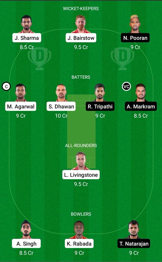 Kane Williamson (c), Abhishek Sharma, Rahul Tripathi, Nicholas Pooran, Aiden Markram, Shashank Singh, Abdul Samad/Jagdish Suchith, Marco Jansen, Bhuvaneshwar Kumar, Umran Malik, T Natarajan
