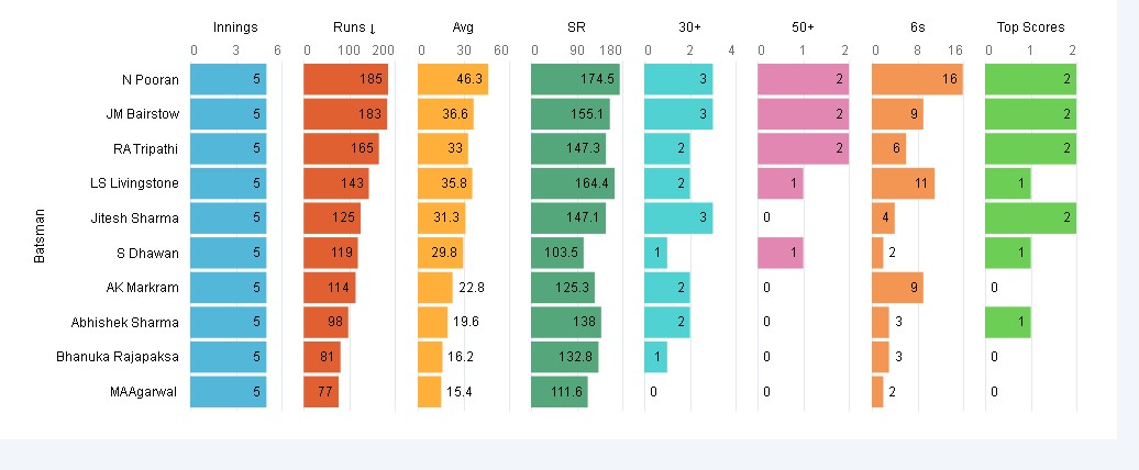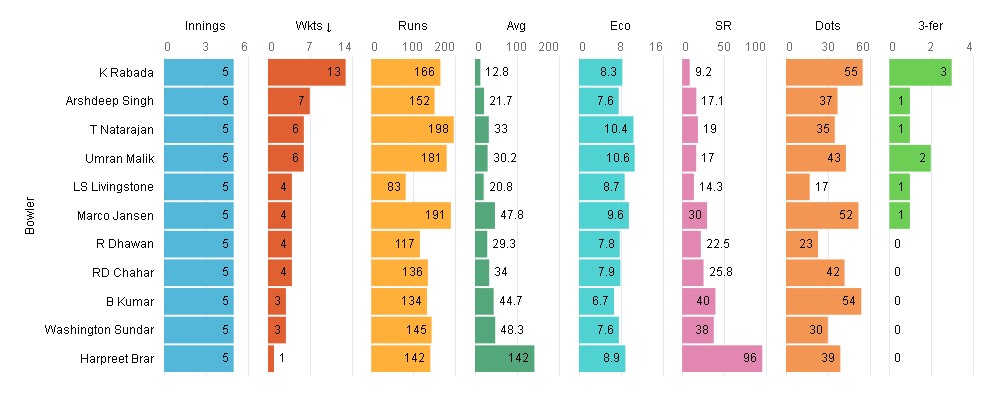 PBKS had one of the most ecplosive batting line ups on paper before this season but they failed to click together as an unit. Mayank Agarwal unexpectadly had his worst season with the bat after scorinh 850 runs at a SR of 150 in last 2 seasons and managed to score only 1 50. Rajapaksa had to make way for Bairstow who himself couldn't buy a run in the middle order. ShahRukh Khan & Odean Smith were another such disappointments. The lone bright spot in the midle order is Liam Livingstone. He has the best SR in this season for a batter and is 3rd on the list of most sixes hit. Arshdeep Singh has the best eco in death overs but is not supported by others enough. This is the 4th consecutive season where Rabada has taken 15+ wkts and is on the brink of fastest to 100 IPL wkts. PBKS have unearthed a gem in Jitesh Sharma. He scored 215 runs at a SR of 158 batting in low middle order.