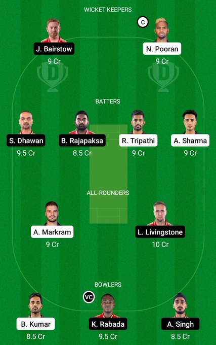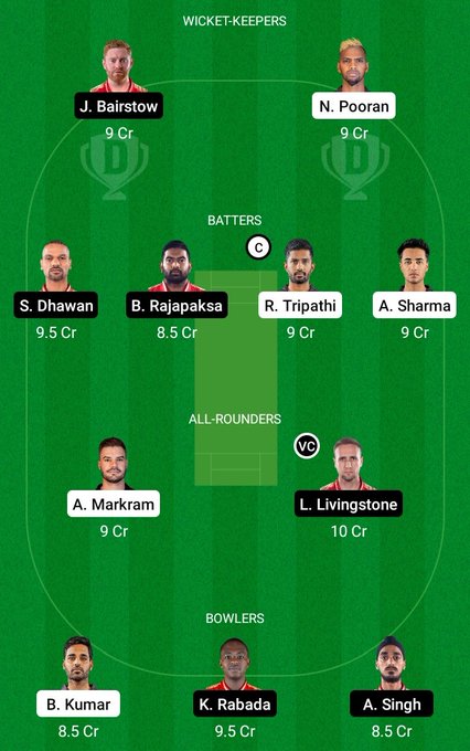 Jonny Bairstow(wk), Shikhar Dhawan, Mayank Agarwal(c), Bhanuka Rajapaksa, Liam Livingstone, Jitesh Sharma, Rishi Dhawan, Kagiso Rabada, Sandeep Sharma/Harpreet Brar, Rahul Chahar, Arshdeep Singh